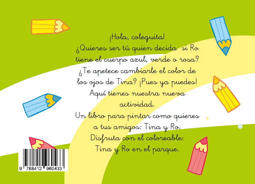 ¿Te lo has pasado bien, coleguita? Ya sabes que si quieres pintarnos tal y como somos, solo tienes que fijarte en el cuento que tiene nuestro mismo nombre: Tina y Ro en el Parque; así nos harás igualitos a como somos, pero si te apetece más dejarte llevar por tu imaginación, inventa y píntanos como más te guste. ¡Hasta pronto!